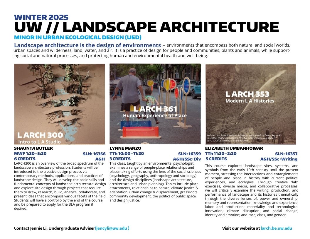 LARCH300 is an overview of the broad spectrum of the landscape architecture profession. Students will be introduced to the creative design process via contemporary methods, applications, and practices of landscape design. They will develop the basic skills and fundamental concepts of landscape architectural design and explore site design through projects that require them to draw, research, build, analyze, collaborate, and present ideas that encompass various facets of the field. Students will have a portfolio by the end of the course, and be prepared to apply for the BLA program if desired.